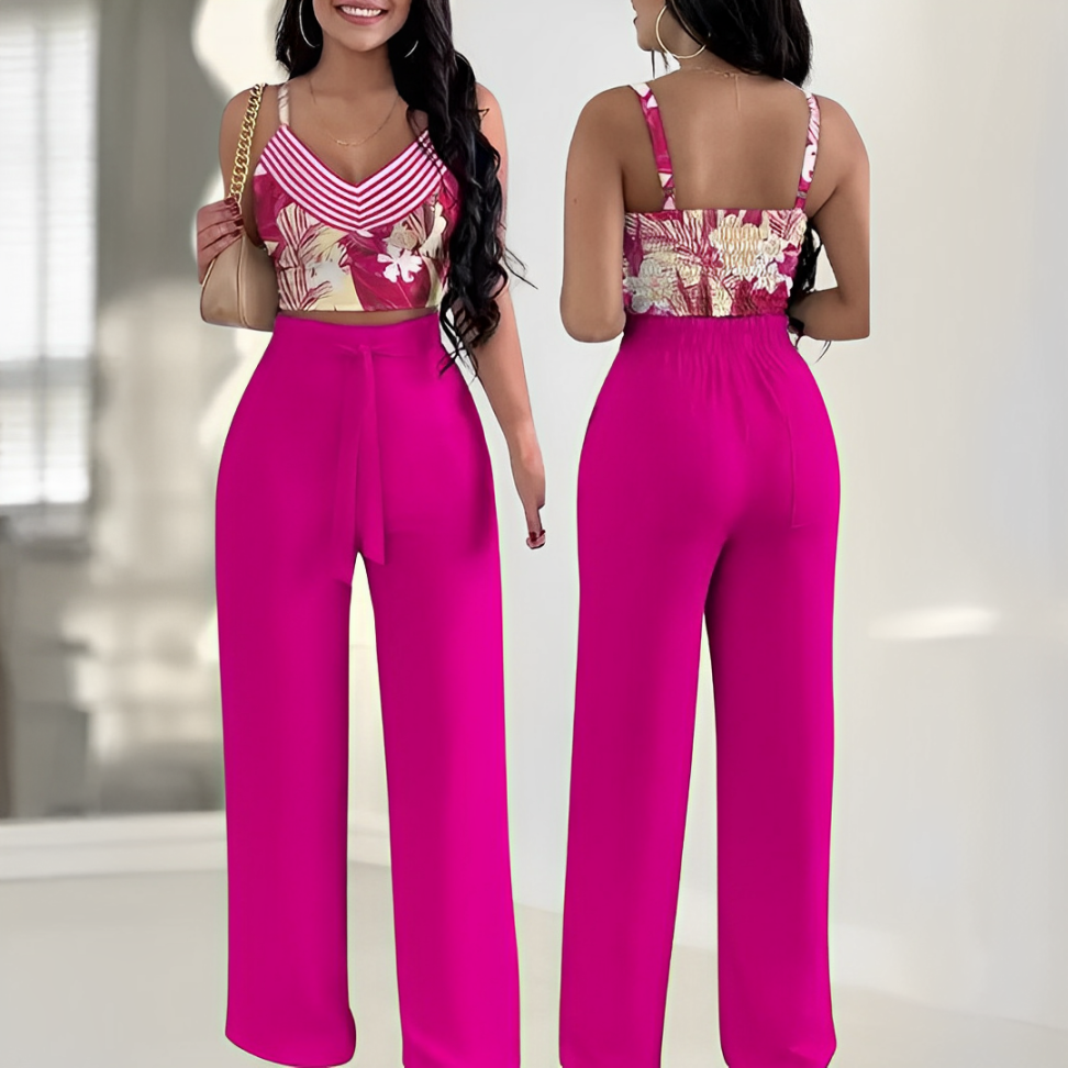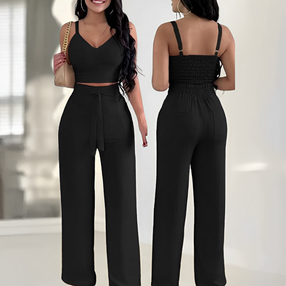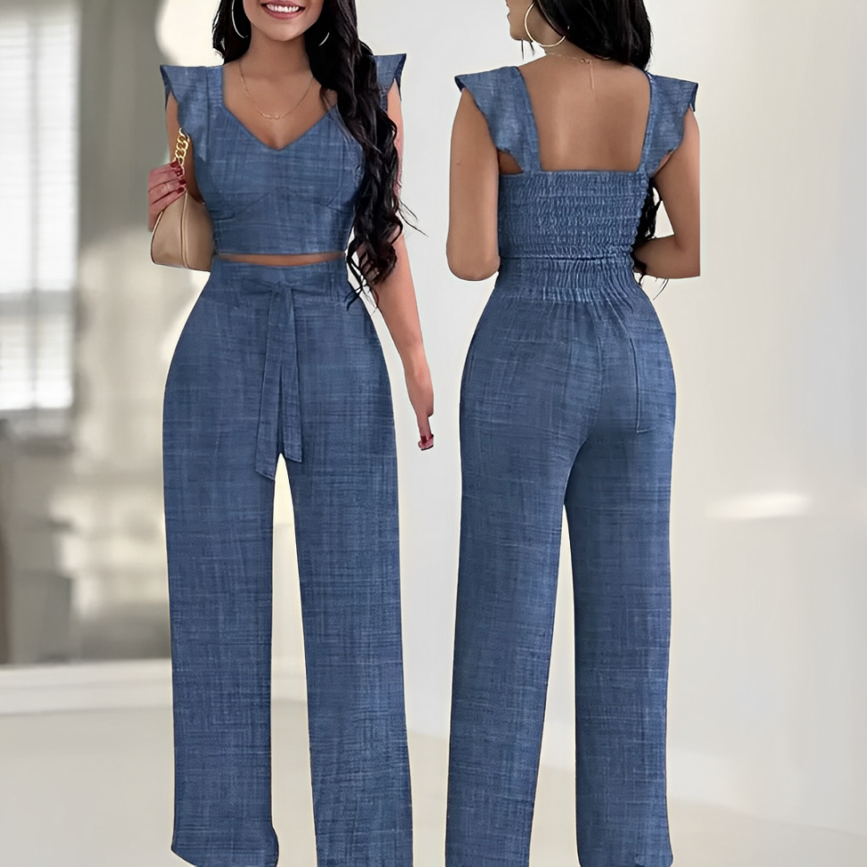 Dieses zweiteilige Hosenset für Frauen vereint Stil und Komfort in einem kompletten Look. Mit seinem weichen und atmungsaktiven Material und dem locker sitzenden Design verleiht es Ihnen einen stilvollen Look, ohne dabei auf Komfort zu verzichten. Das Oberteil hat eine schmeichelhafte Passform, die perfekt zu der luftigen, hoch taillierten Hose passt. Egal, ob Sie sich zu Hause entspannen oder mit Freunden ausgehen, das Set macht jede Bewegung mit und fühlt sich den ganzen Tag lang gut an. Es wurde für Frauen entworfen, die bequeme Mode mit Charakter suchen, und jedes Teil ist so gefertigt, dass es sowohl Leichtigkeit als auch Stil bietet.